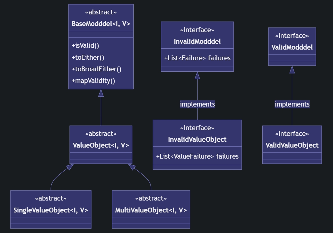 ValidModddel/InvalidModddelandBaseModddel, and also no association betweenValidValueObject/InvalidValueObjectandValueObject. That's on purpose because those interfaces can be directly implemented in some cases, and we don't want theBaseModddelmethods to be inherited. (See the models that are always valid / invalid section).