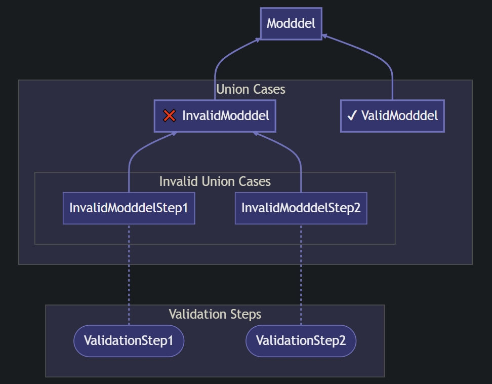 We start with the first validationStep and process its validations. If at least one validation fails, the whole Modddel is invalid and becomes an instance of the invalid-step union-case matching the failed validationStep. If all validations pass, we move to the next validationStep. If all validationSteps pass, the Modddel is valid and becomes an instance of the "Valid" union-case.